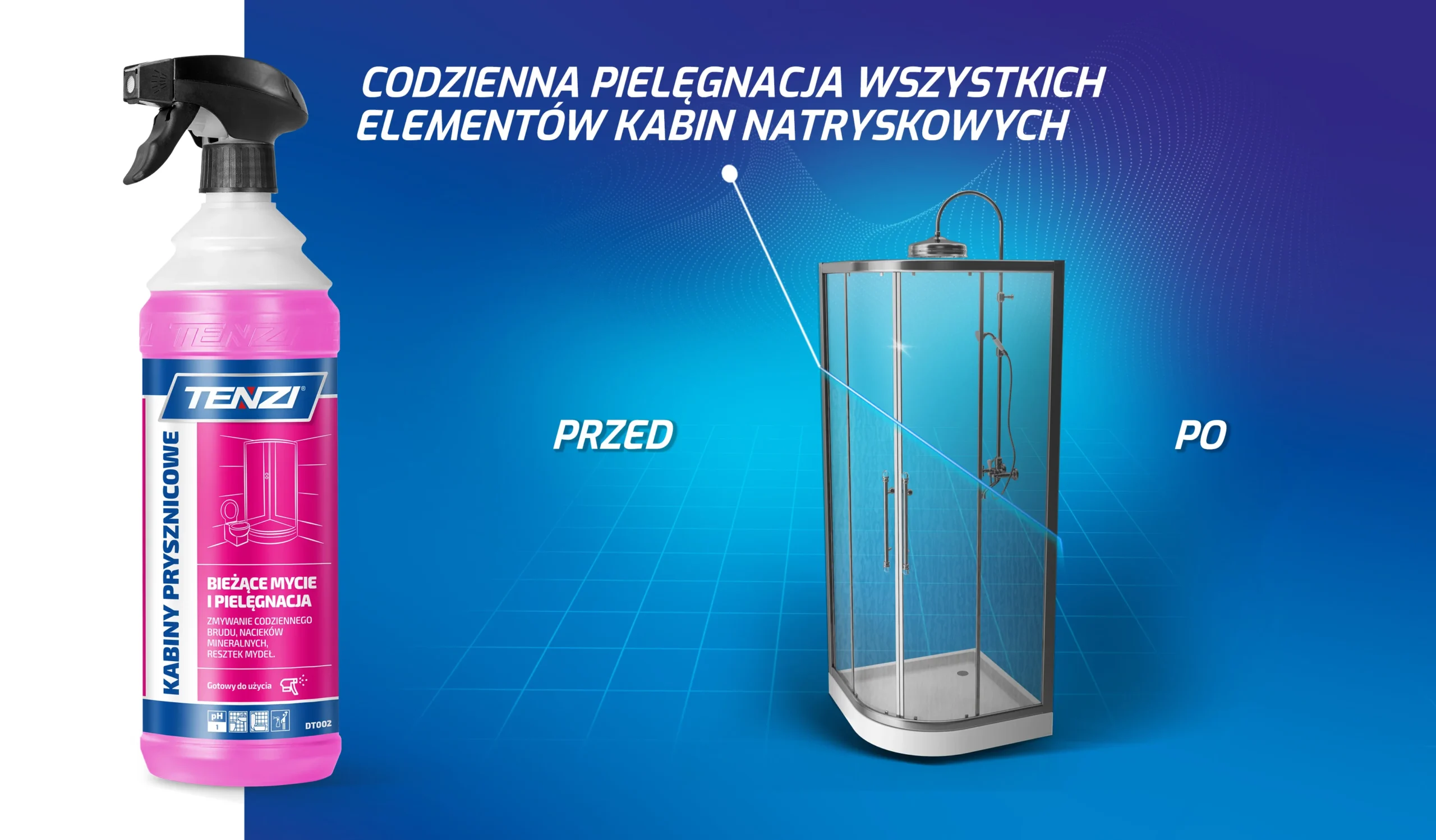 Tenzi Kabiny prysznicowe to gotowy do użycia preparat stworzony do codziennej pielęgnacji wszystkich elementów kabin natryskowych w domach, hotelach i biurach. Skutecznie usuwa typowe zabrudzenia łazienkowe, takie jak nacieki mineralne oraz resztki mydeł, z powierzchni szklanych, akrylowych i emaliowanych. Dzięki formule opartej na kwasie cytrynowym produkt przywraca blask i pozostawia świeży zapach, dbając o czysty spokój w Twojej łazience.