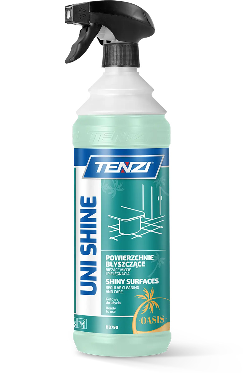 Uni Shine Oasis to gotowy do użycia preparat do mycia i pielęgnacji powierzchni błyszczących, takich jak meble, blaty, boazerie czy elementy dekoracyjne. Skutecznie usuwa kurz, smugi i codzienne zabrudzenia. Nie pozostawia tłustych śladów. Jest bezpieczny dla delikatnych materiałów, takich jak powierzchnie lakierowane, szkliwione czy glazurowane. Wyróżnia się wysoką wydajnością i łatwością użycia. Pozostawia świeży, subtelny zapach perfum, który długo unosi się w powietrzu.